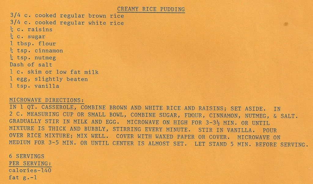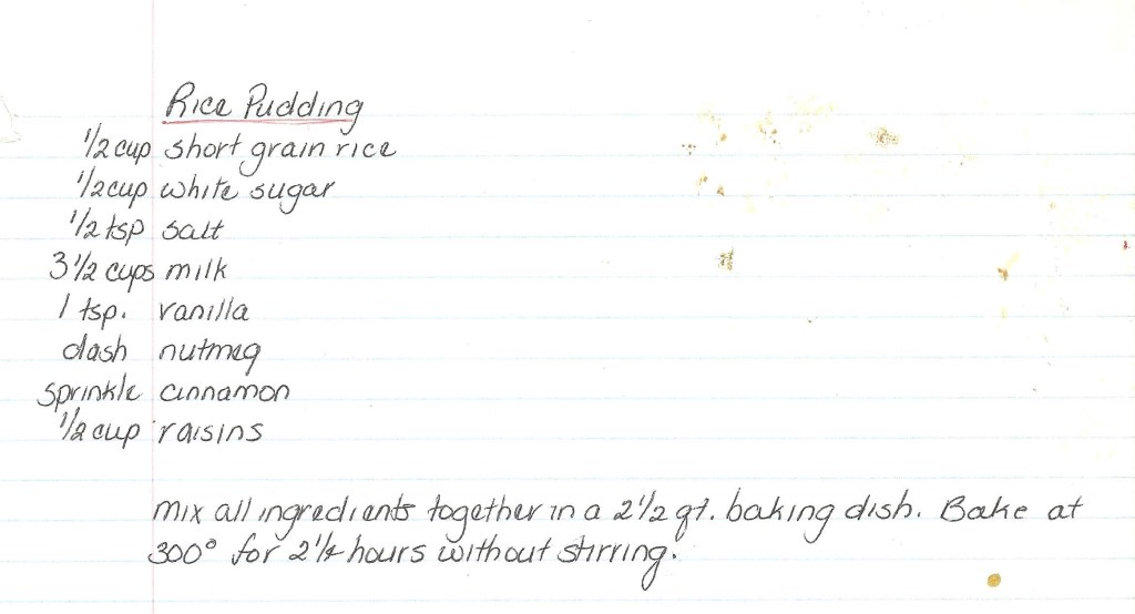 Grandma’s cookbook actually had three recipes for rice pudding. I had originally been thinking I would blog all three, but the baked version (in mom’s handwriting) was an edible failure. The rice-to-wet-ingredients ratio seemed off to me but I decided to trust the recipe for the most part and… I baked the pudding basically to oblivion.