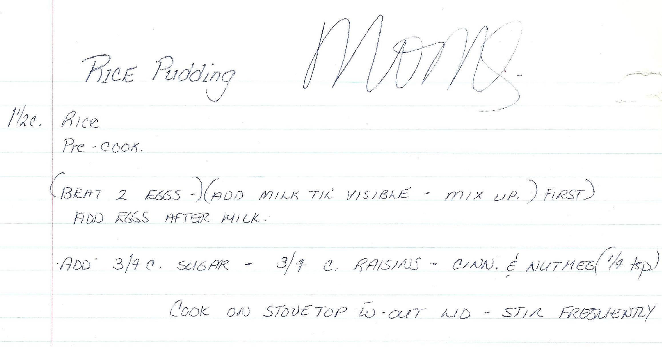I’m attributing this recipe to my mom because the only record I have of it is in her handwriting, although she refers to it as Mom’s Rice Pudding. Perhaps aptly named because it ended up being HER rice pudding and now that I’ve fiddled a bit with the ratios and changed to a plant-based milk, it will my MY rice pudding, from my kids’ perspective.