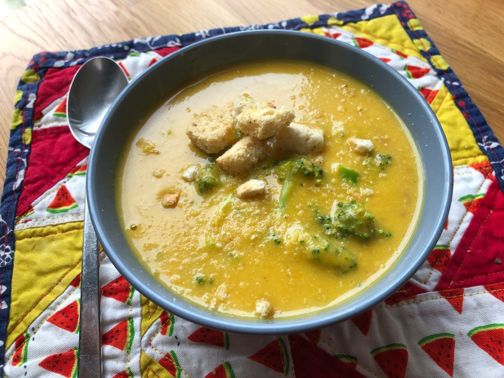 Return to the pot and heat pureed soup over low. Add paprika, salt, and pepper to taste. Add broccoli and cook until al dente. Serve with croutons.