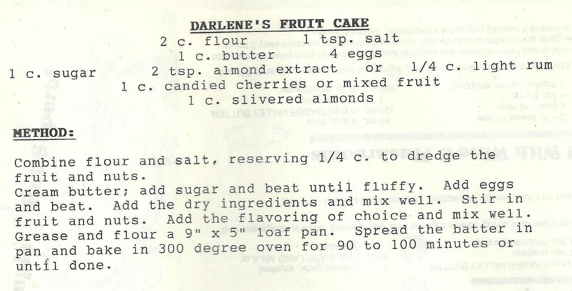 Darlene was a good friend of Grandma Donna. Of my grandma’s few fruit cake recipes, I chose to try this one first because it required the fewest ingredients and had the shortest baking time. I like that’s it’s lighter and less fussy than traditional fruit cake, something I would enjoy for breakfast with a cup of tea. If you don’t usually like fruit cake, you might like this one!
