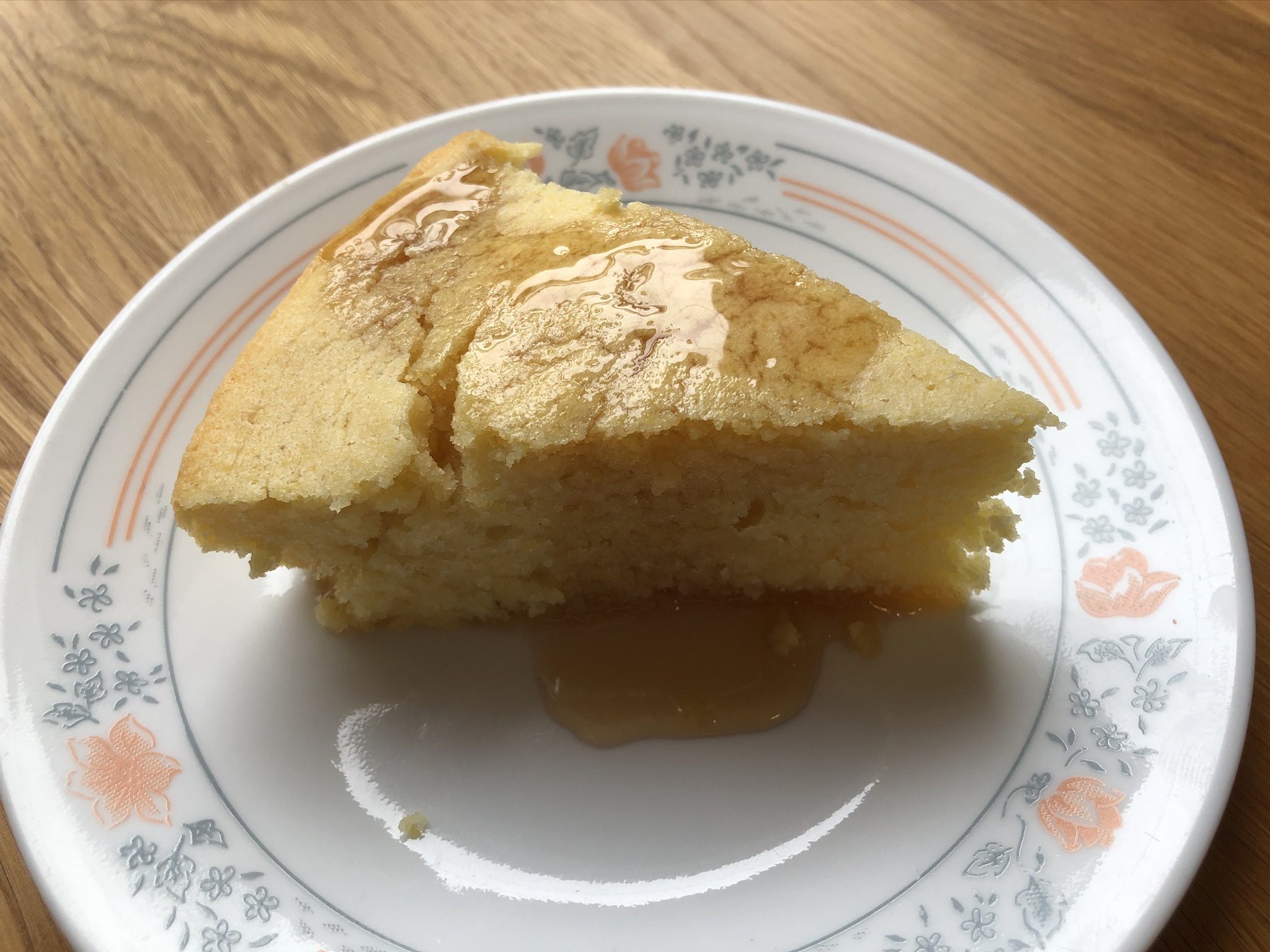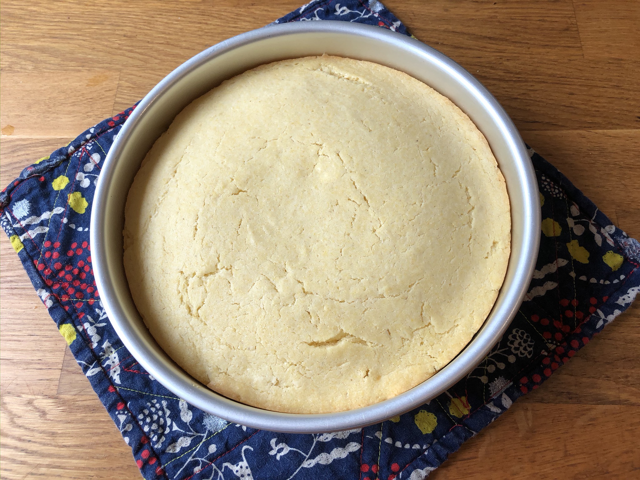 Add the sifted dry ingredients to the creamed sugar, alternating with the egg and soy milk mixture. Blend the cornmeal in at the end. Turn into a greased 8” cake pan. Bake for 40-45 minutes or until the cake springs back when lightly touched. Cool 5 minutes, then remove from the pan. Serve hot with maple syrup.