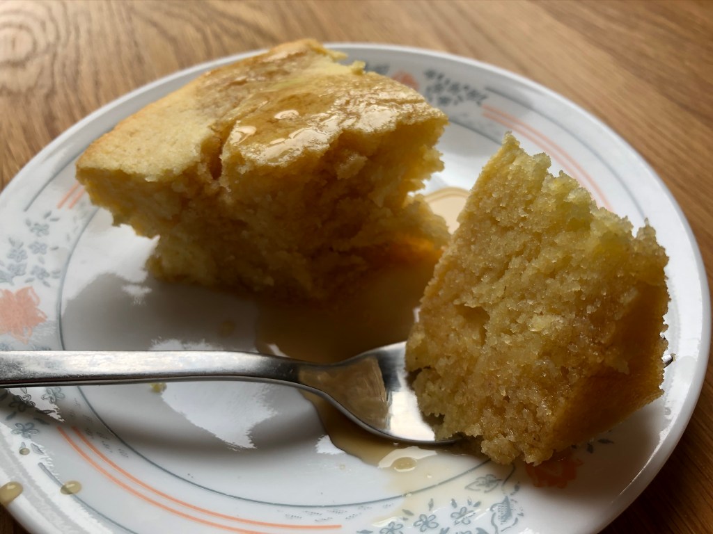 This was in Grandma’s cookbook in the breakfast section. It’s lighter and smoother than cornbread – a great alternative for a morning treat.