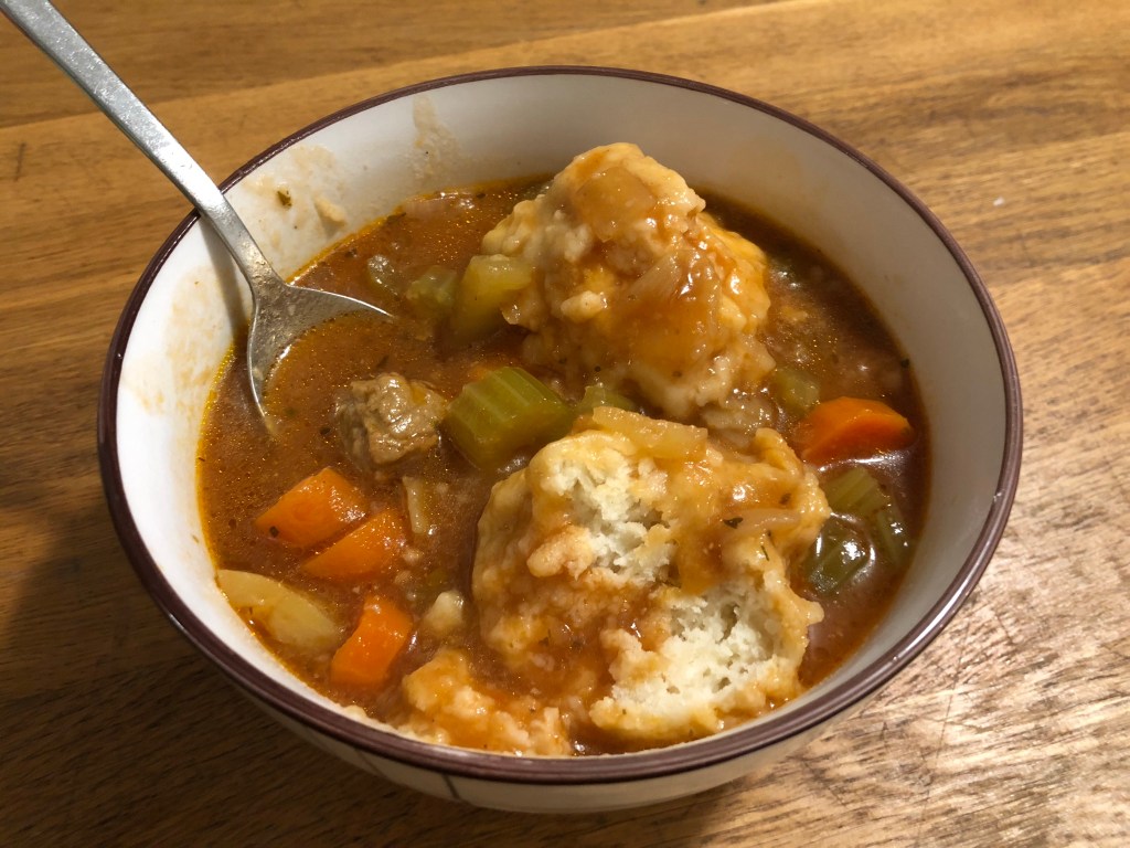 This is a very delicious, hearty, stick-to-your-ribs meal that, let’s be honest, is really just a medium in which to cook my mom’s delicious homemade dumplings.