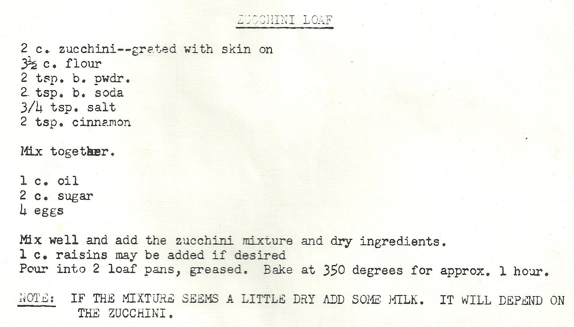 Pour into 2 loaf pans, greased. Bake for approximately 1 hour or until a toothpick comes out clean.