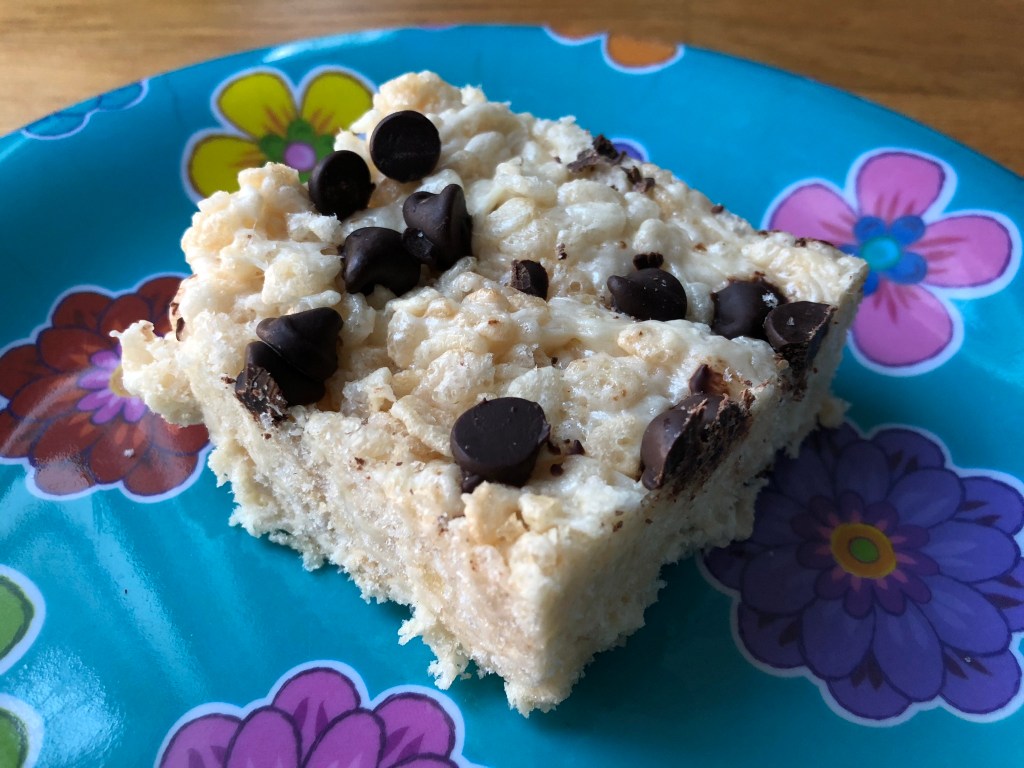 Press the cereal mixture into the prepared baking dish and smooth the top. While the cereal mix is still warm, sprinkle chocolate chips on top and press in, gently. Let cool, slice and serve.