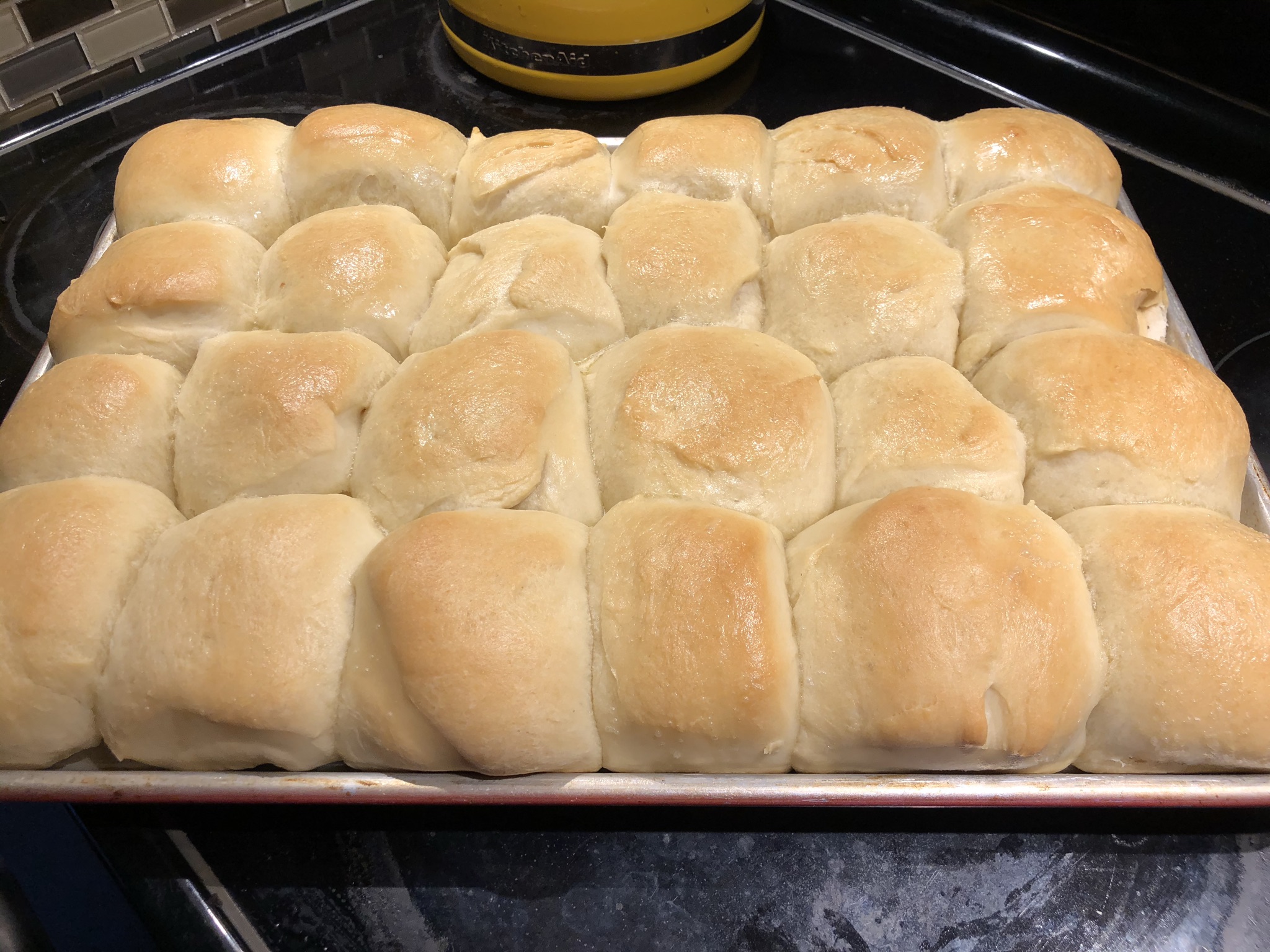 Preheat oven to 375o. Bake 20-25 minutes or until golden on top and interior temperature of the buns has reached 190o. Apply a wash of melted earth balance immediately after removing from oven.