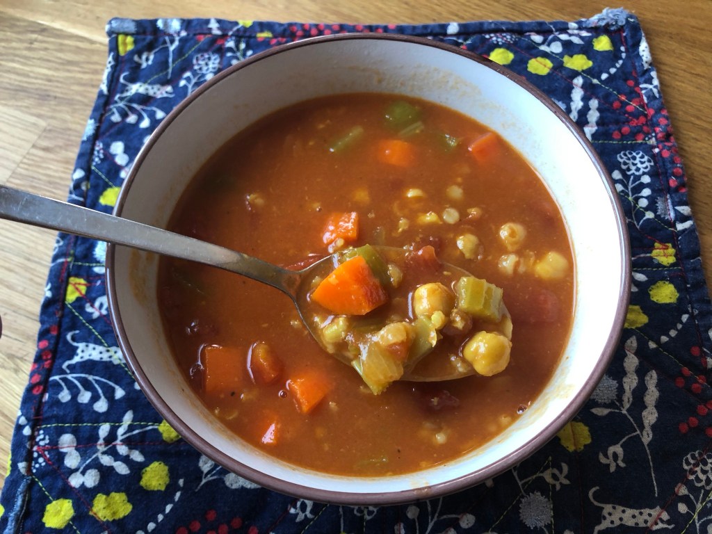 Heat the Earth balance in large pot. Add the onion, celery and carrots (and apples, if using) and cook until lightly browned. Stir in the chickpeas and then flour and curry powder. Add in the vegetable broth gradually, stirring constantly.