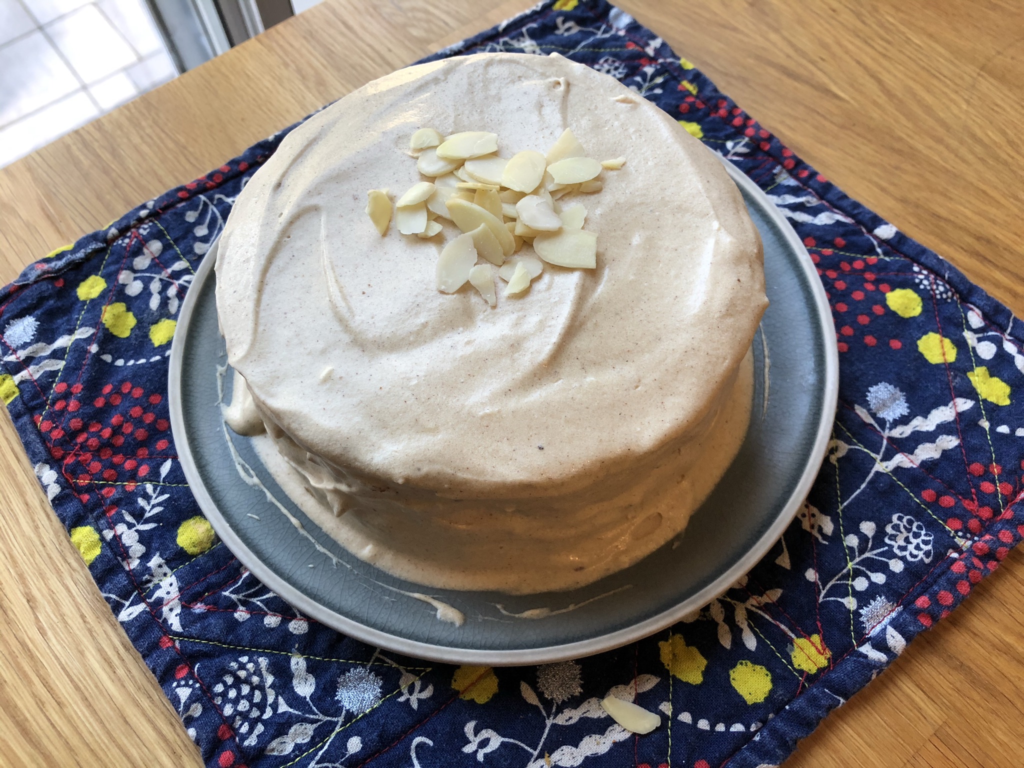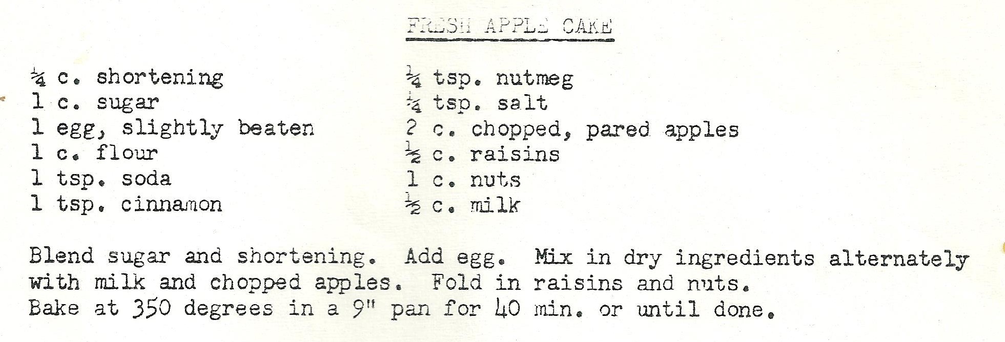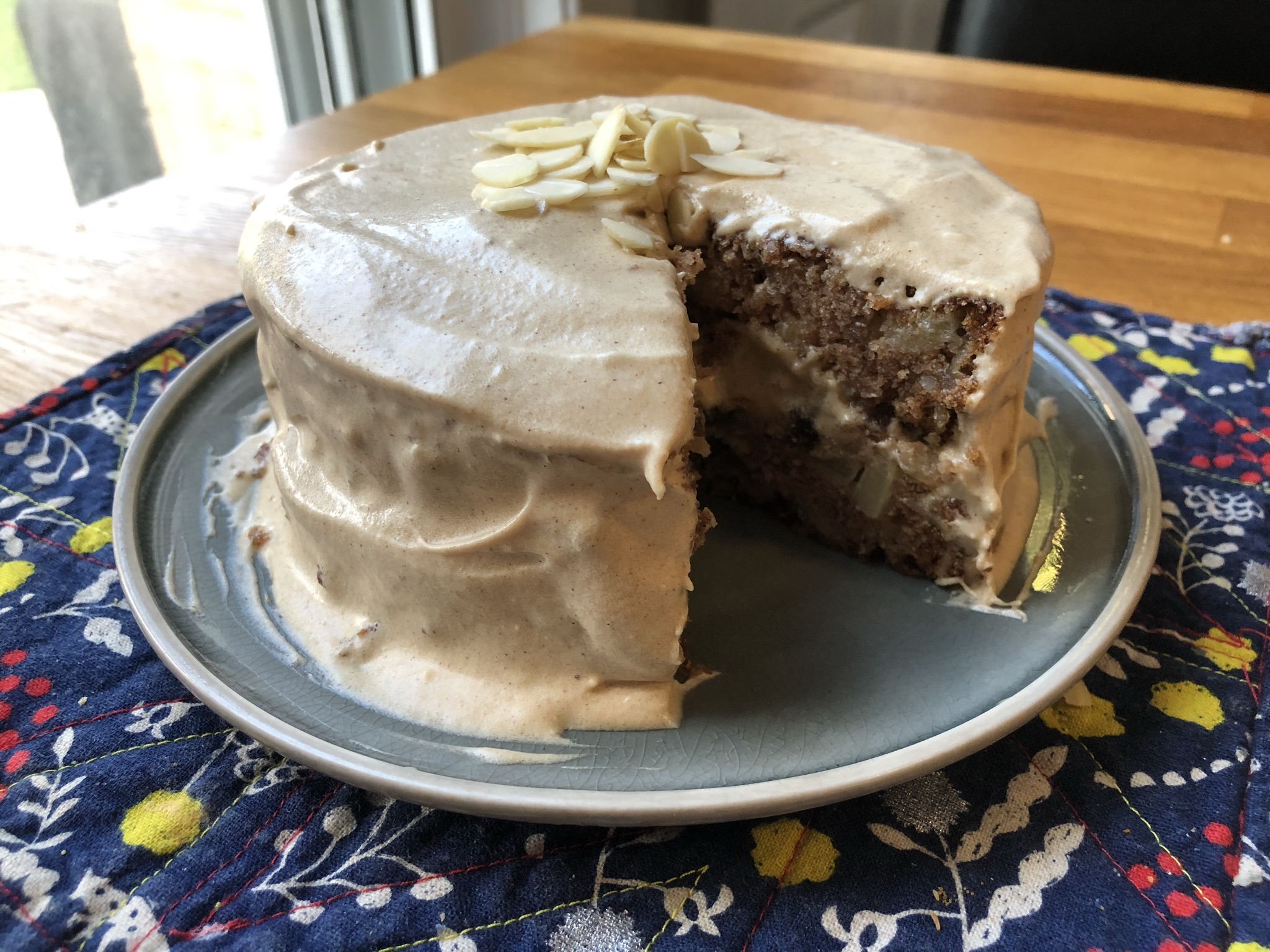 Blend the sugar and vegetable shortening. Add egg. In a separate bowl, whisk together the dry ingredients. Add the dry ingredients gradually to the creamed sugar, alternating with soy milk and chopped apples. Fold in raisins and nuts (slivered almonds were used in the cake pictured but chopped pecans would also work well). Bake in a 9” pan for 40 mins or until a toothpick comes out clean.