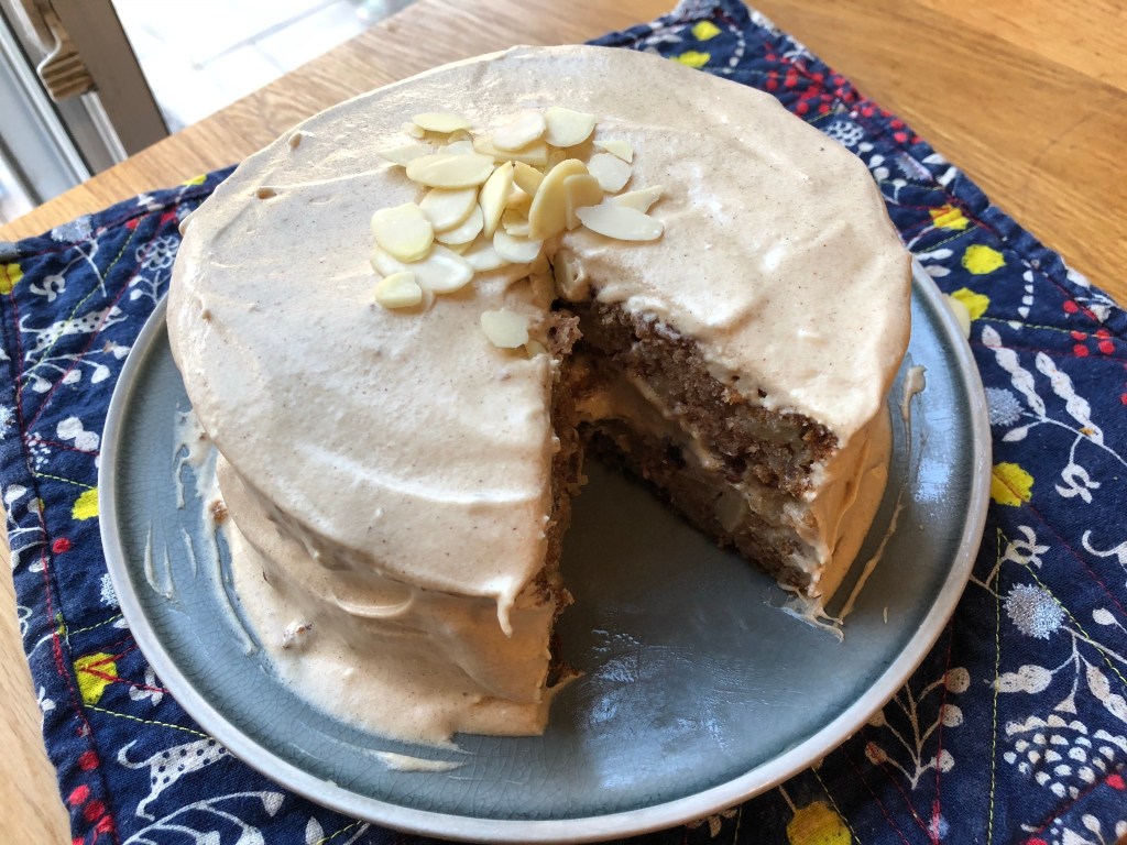 This apple cake is moist and delicious. I’ve finished it with a brown sugar frosting in the photo.