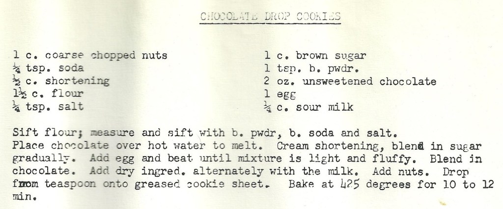 Add in the dry ingredients, alternating with the sour soy milk. Stir in the chopped nuts at the end. Drop from teaspoon onto greased cookie sheet and bake for approx. 10 min.
