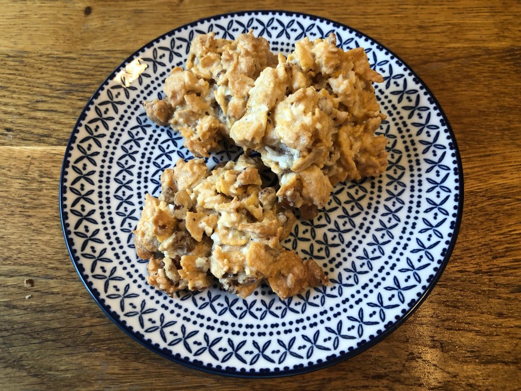 I was very intrigued when I first saw this recipe – it calls for nuts, cornflakes and shredded coconut? And no flour? Well – they turned out a lot like a coconut macaroon and are likewise gluten free (provided you purchase gluten free corn flakes).