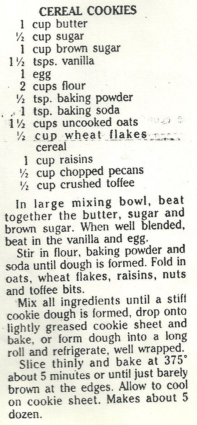 Stir in flour, baking powder and baking soda until dough is formed. Fold in oats, corn flakes, raisins, nuts and toffee bits. Mix all ingredients until a stiff cookie dough is formed. Drop onto lightly greased cookie sheet and bake for 12-15 minutes or until just barely brown at the edges. Allow to cool on cookie sheet.