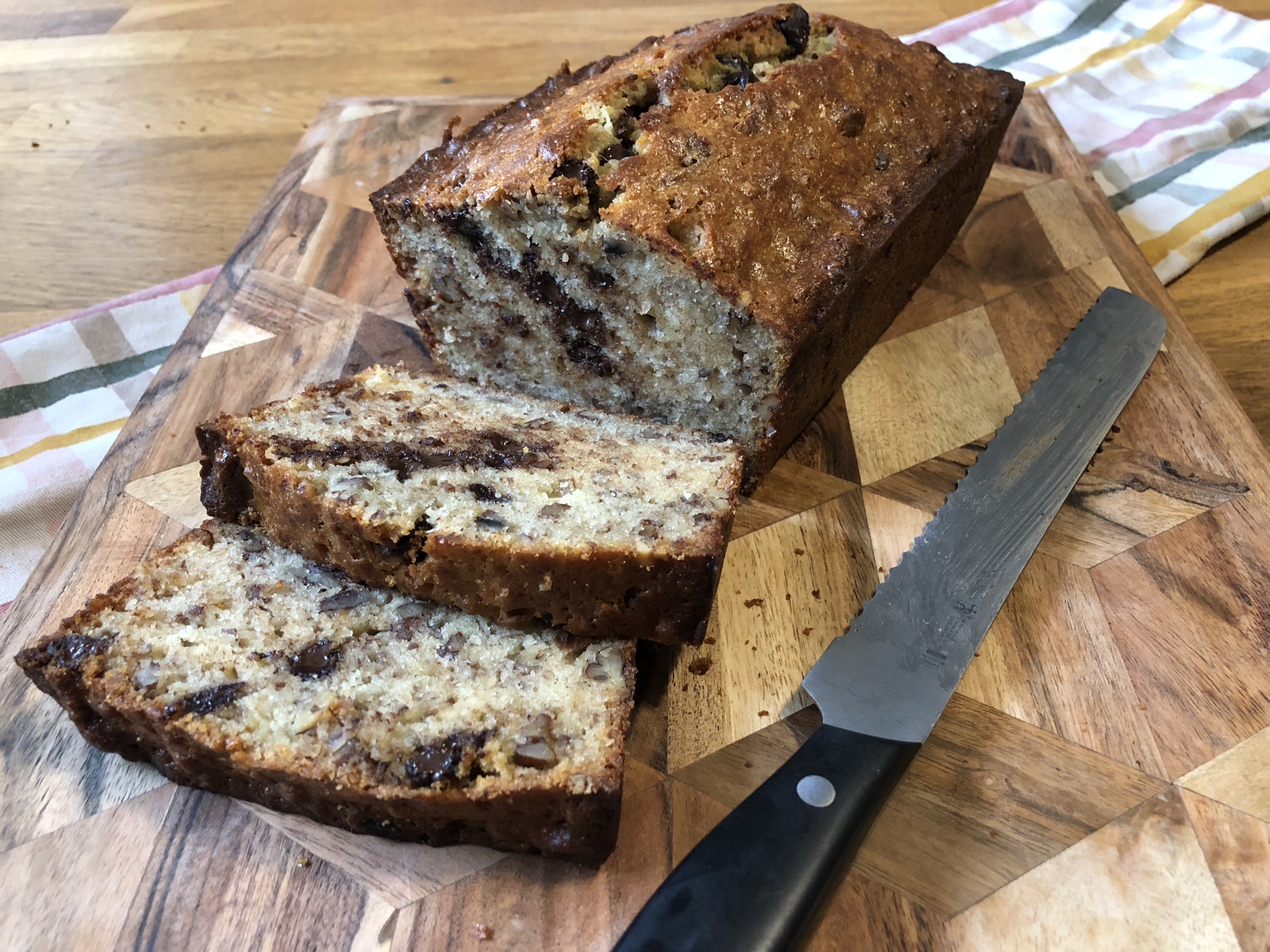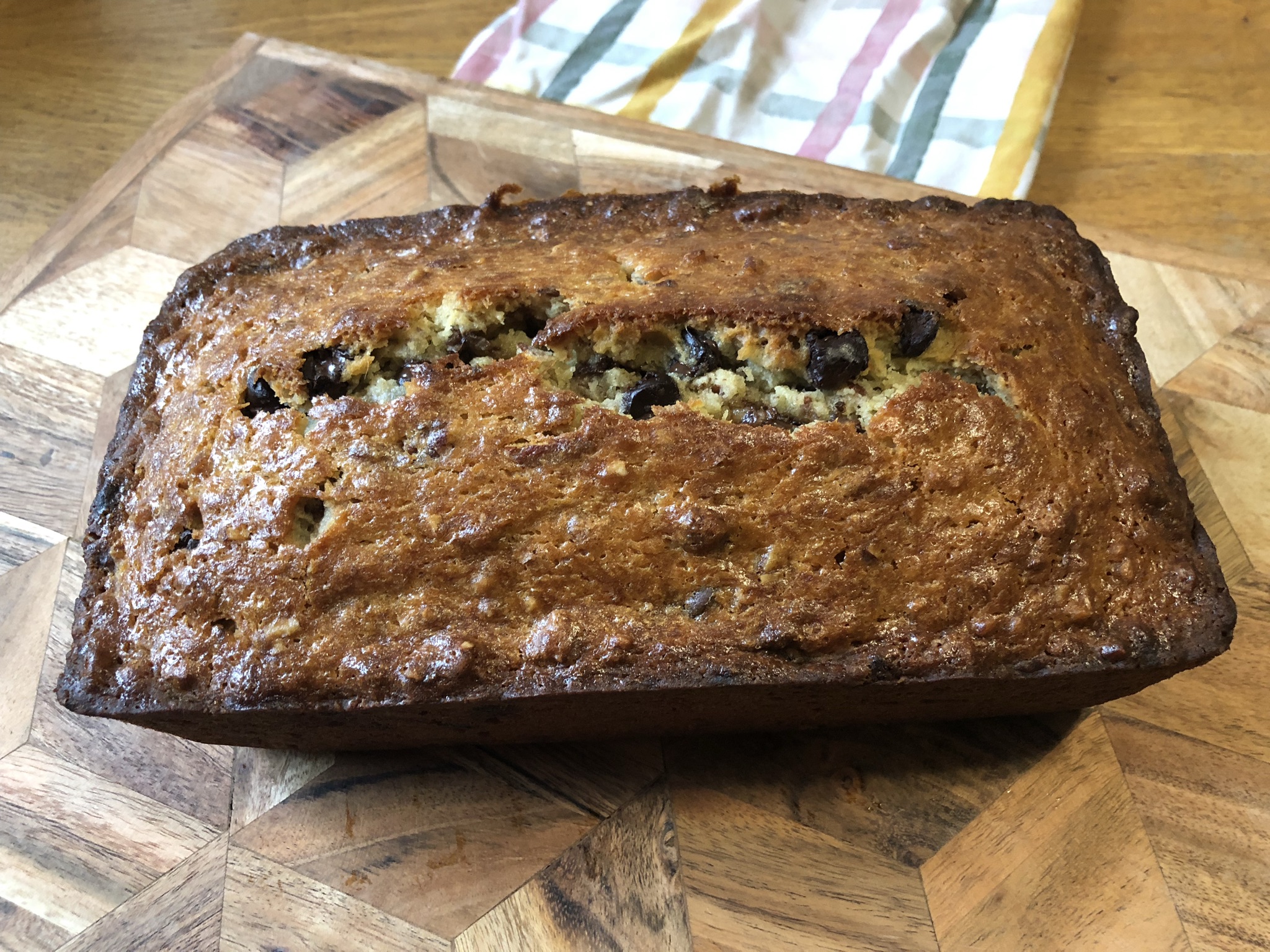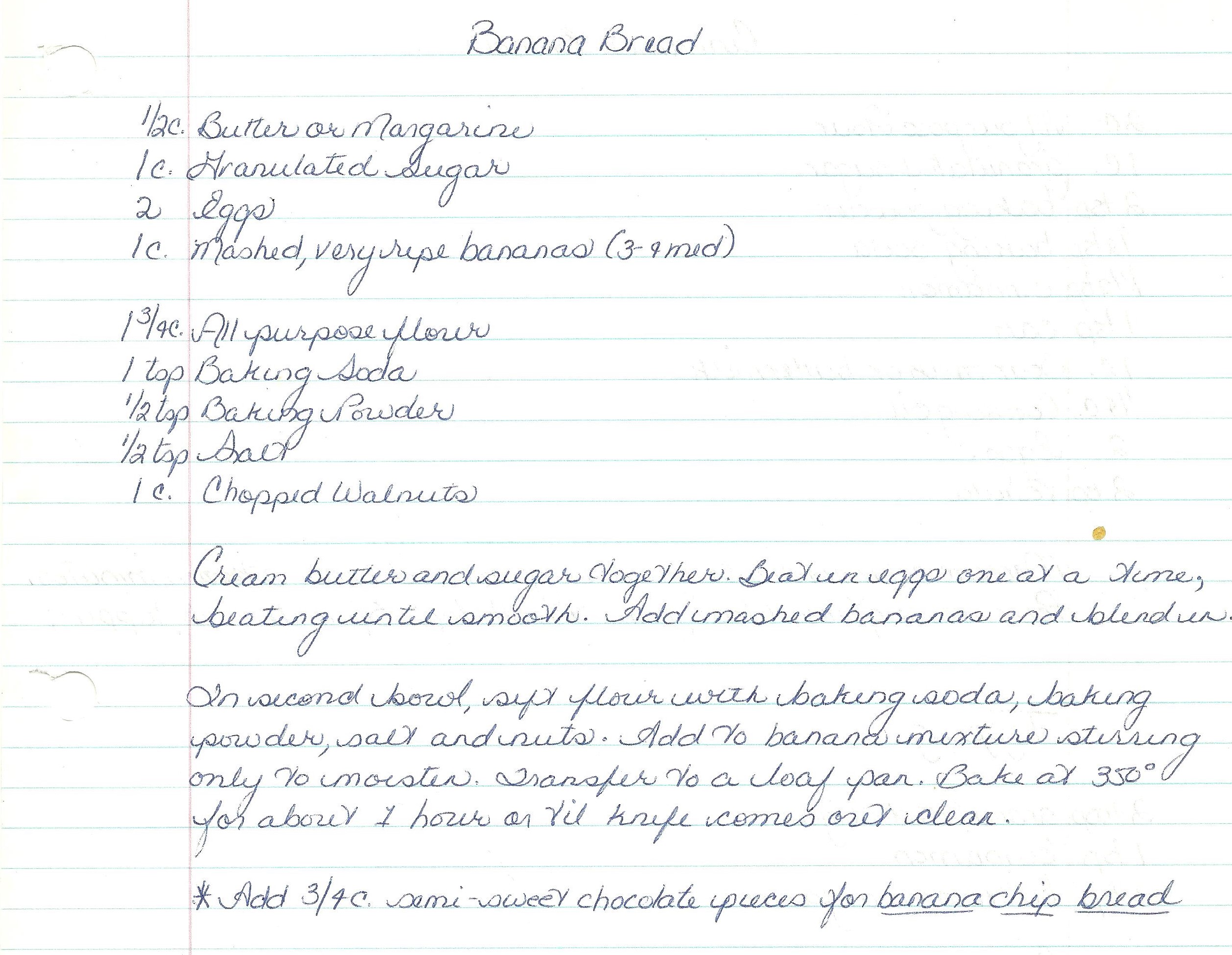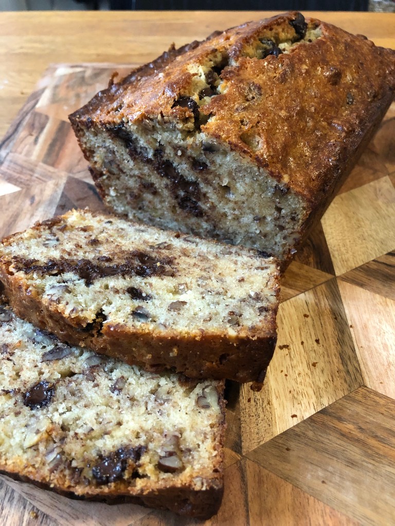 As an avid lover of banana bread I’m sort of surprised it took me this long to get around to making mom’s recipe. I’m used to a darker banana bread (usually darker on account of brown sugar) but the granulated white sugar makes for a distinct sort-of caramelized crust that really won over my friends and family. And who doesn’t love chocolate chips?
