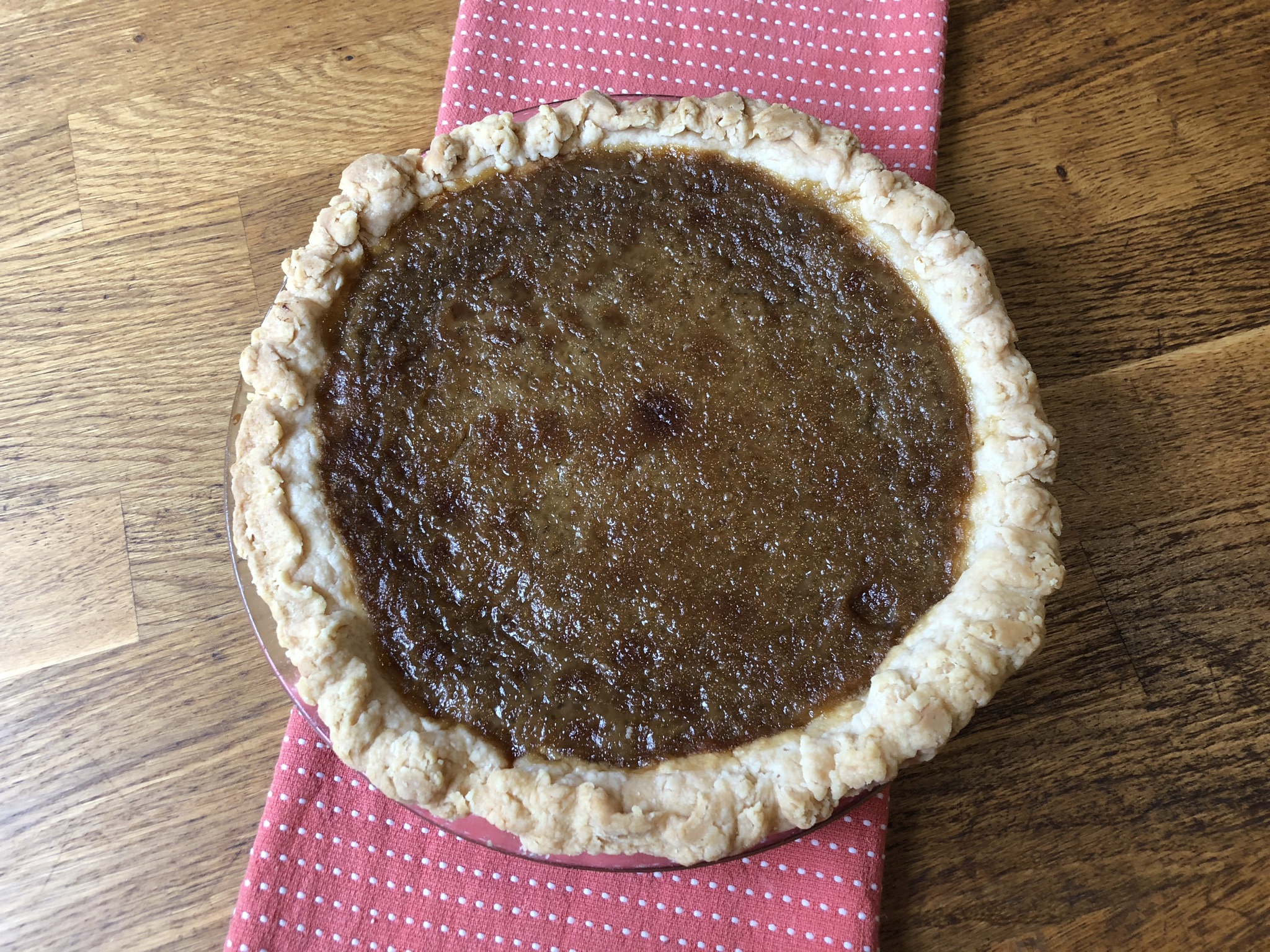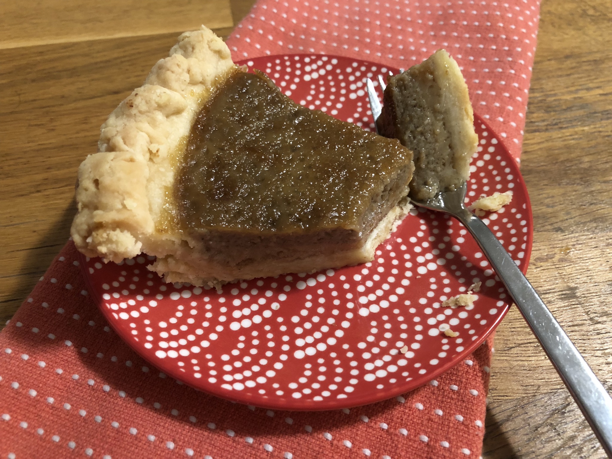 I didn’t know what to expect, but it’s a very flan-like custard pie. My wife says the butterscotch pie she is familiar with always had meringue on top – my next attempt I will try that variation. Otherwise I recommend coconut whipped cream.