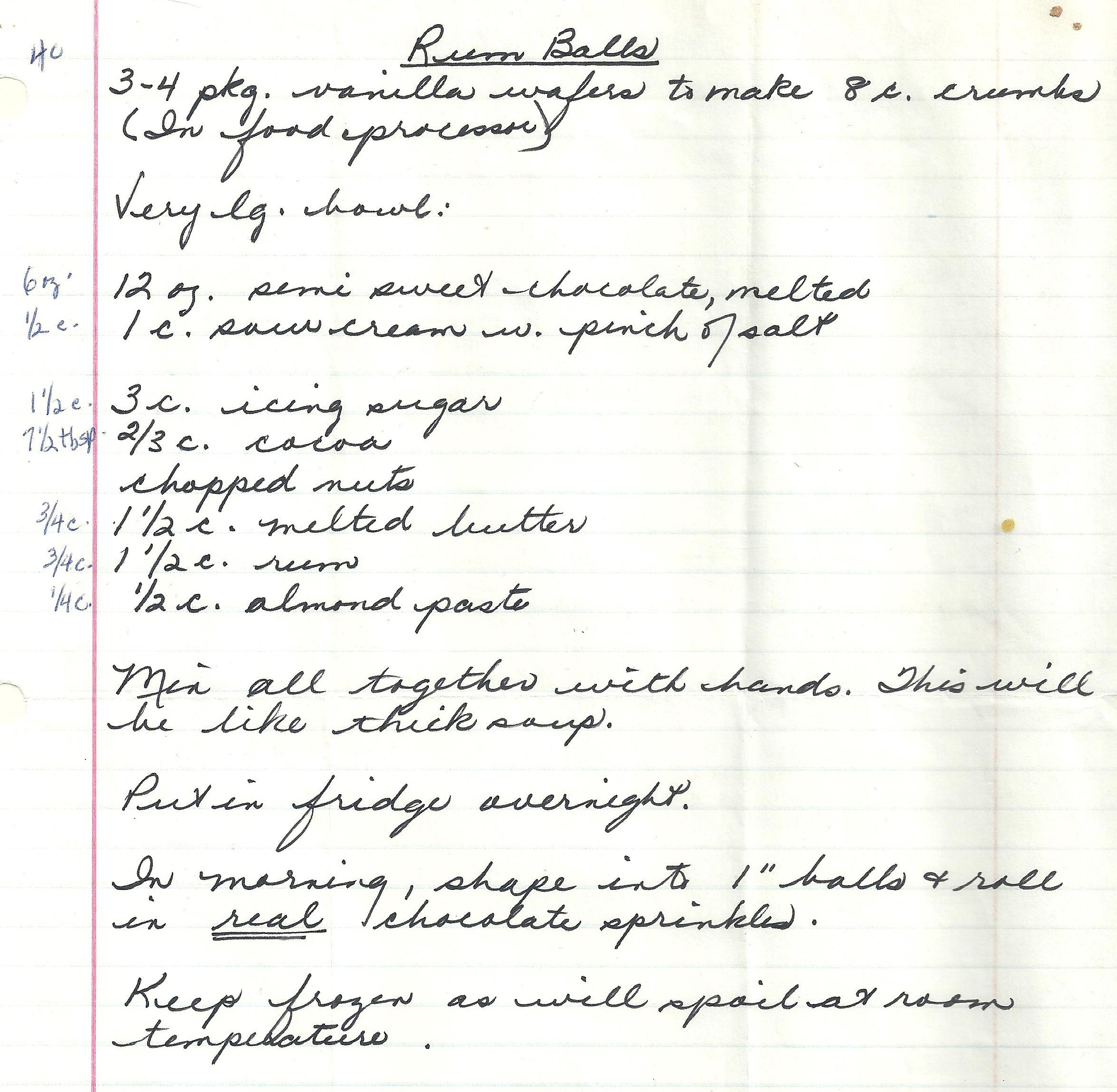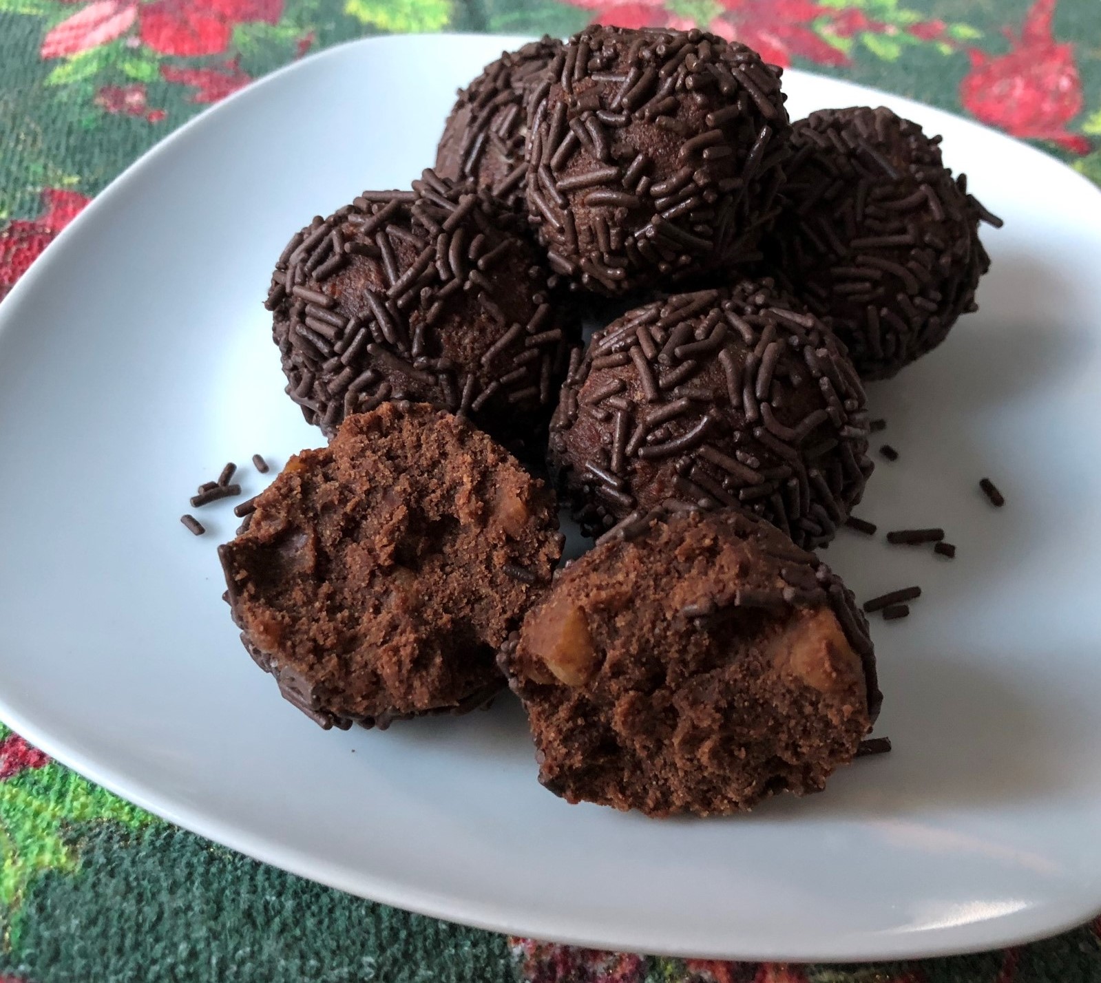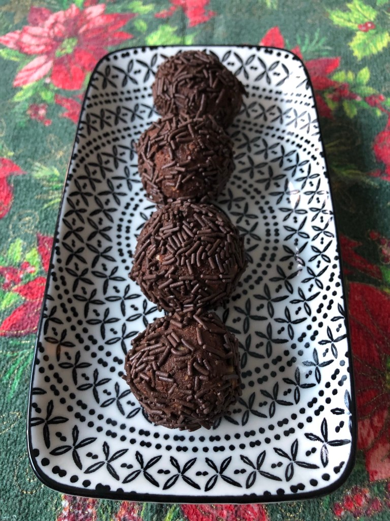 When the “dough” is cold and stiff, shape into 1” balls and roll them in chocolate sprinkles. Keep cold or frozen as they will spoil easily at room temperature.