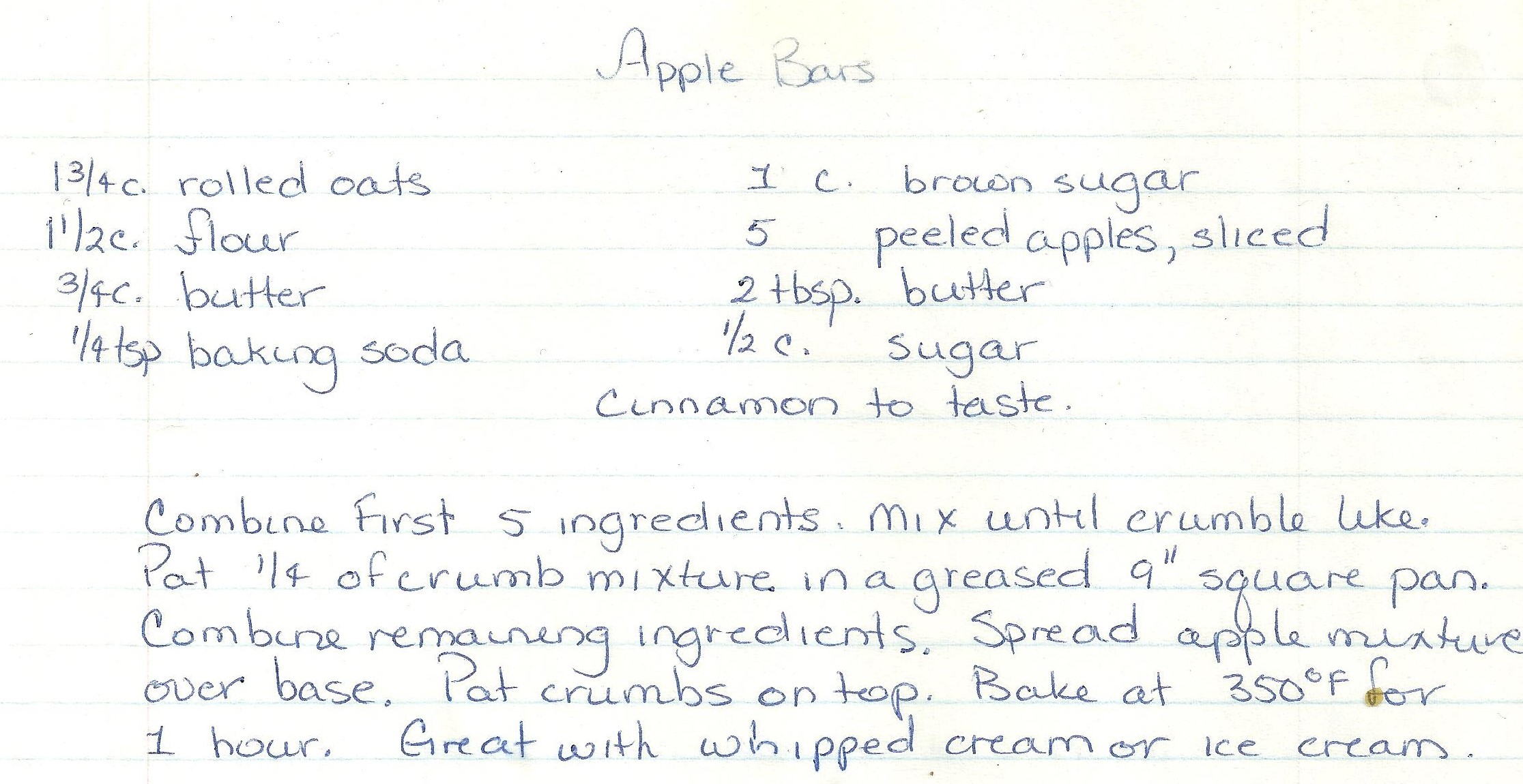 In a large bowl, combine the base and crumble ingredients. Mix until it is crumble-like. Pat 1/3 of crumb mixture in a greased 9” square pan. In a separate bowl combine the filling ingredients. Spread apple mixture over base. Pat remaining crumbs on top. Bake for 1 hour. Let cool to serve as a “bar”. Best when served with whipped or ice cream.