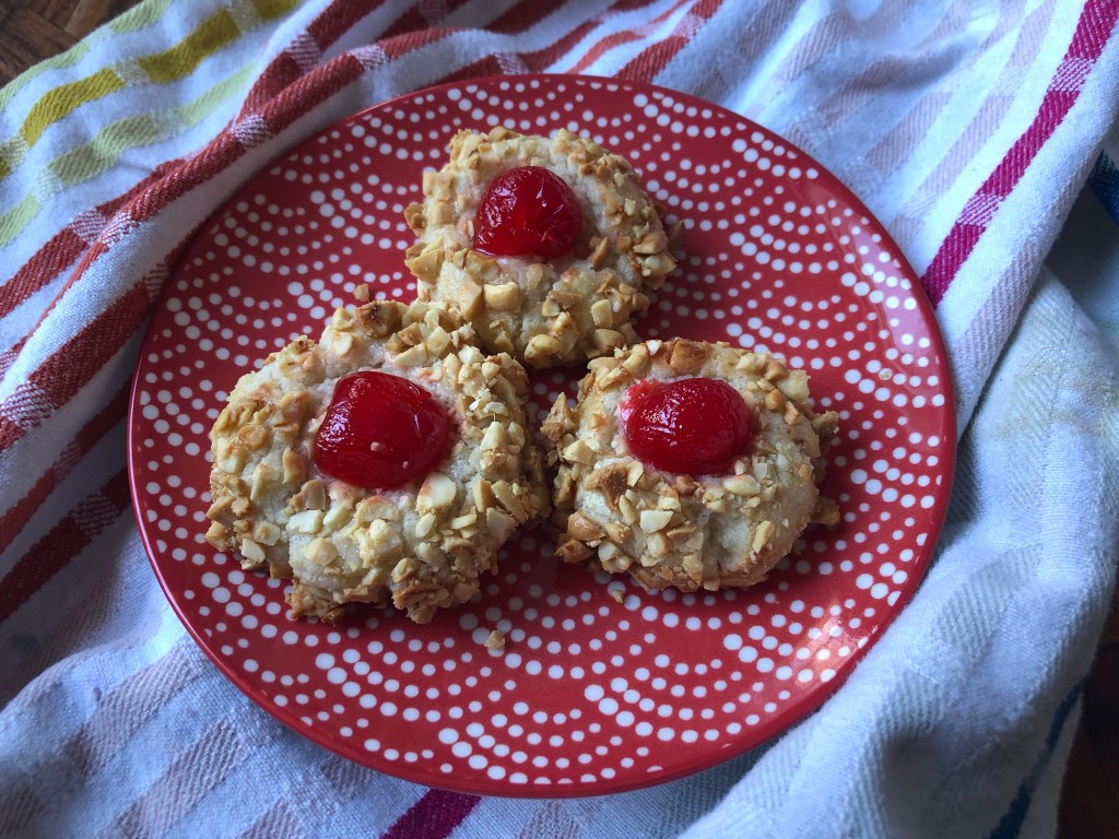 Cream Earth Balance and sugar, add yolk. Beat well. Add flour and salt, a little at a time. Roll the dough into small balls in the palm of your hand then roll each ball in the egg white (slightly beaten) before rolling in the chopped peanuts. Flatten slightly by placing a 1/2 cherry on top of each ball or by making a small indent and filling with a tsp of raspberry or strawberry jam.