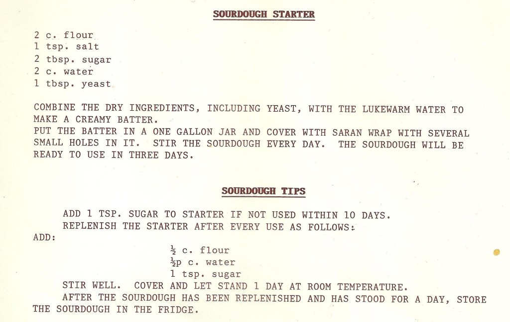 Nicole’s notes: Use a one-gallon jar. Grandma wasn’t kidding. The starter really rises. Also, I found I had to feed the starter every day in the first few days. I added another ½ cup of water and ½ cup of flour (my starter fell after mixing).