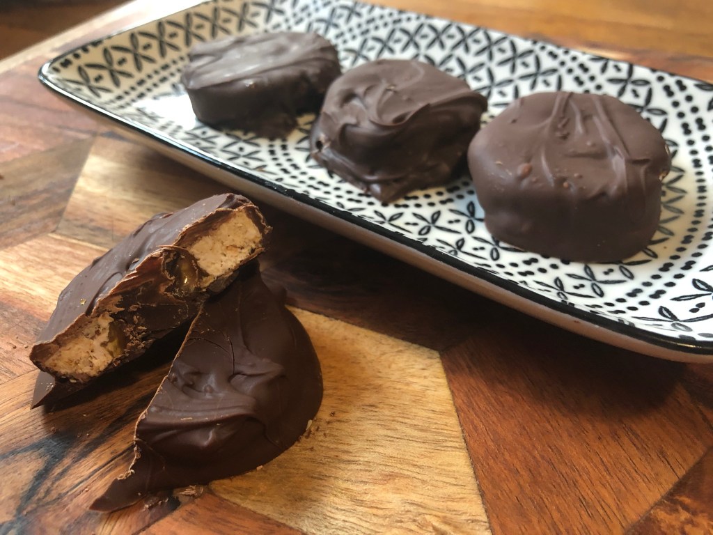This treat was inspired by Grandma Donna’s recipe for Marshmallow Cookies. The first thing I thought was that the cookies shouldn’t have dates, instead, they needed chocolate! These non-cookies have home-roasted almonds and homemade caramel to give them bit of the smoky taste of a s’more along with the marshmallows, graham crackers and chocolate. They also have a bit of a nod to wagon wheels, but so so much better.